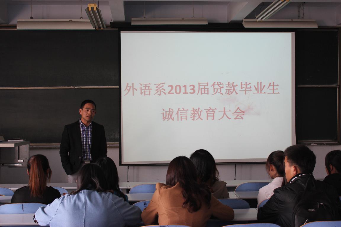 2013年4月11日下午,外语系在教三楼312召开国家助学贷款毕业生就业指导及诚信教育大会,系党总支杜红亮副书记、辅导员老师及2013届贷款毕业生参加了大会。