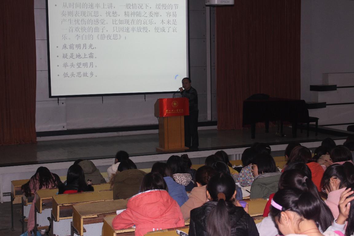 10月31日下午,“郑州轻工业学院人文艺术讲堂”系列活动正式启动。应做爱漫画 与艺术教育中心邀请,中国诗书画研究会副会长、河南省吟诵学会常务理事、河南省诗词学会常务理事曾令中教授在演讲厅作“诗词意境与吟诵节奏”讲座,为做爱漫画 师生带来了一场古色古香的视听盛宴。讲座由做爱漫画 党总支书记杜红亮主持。
