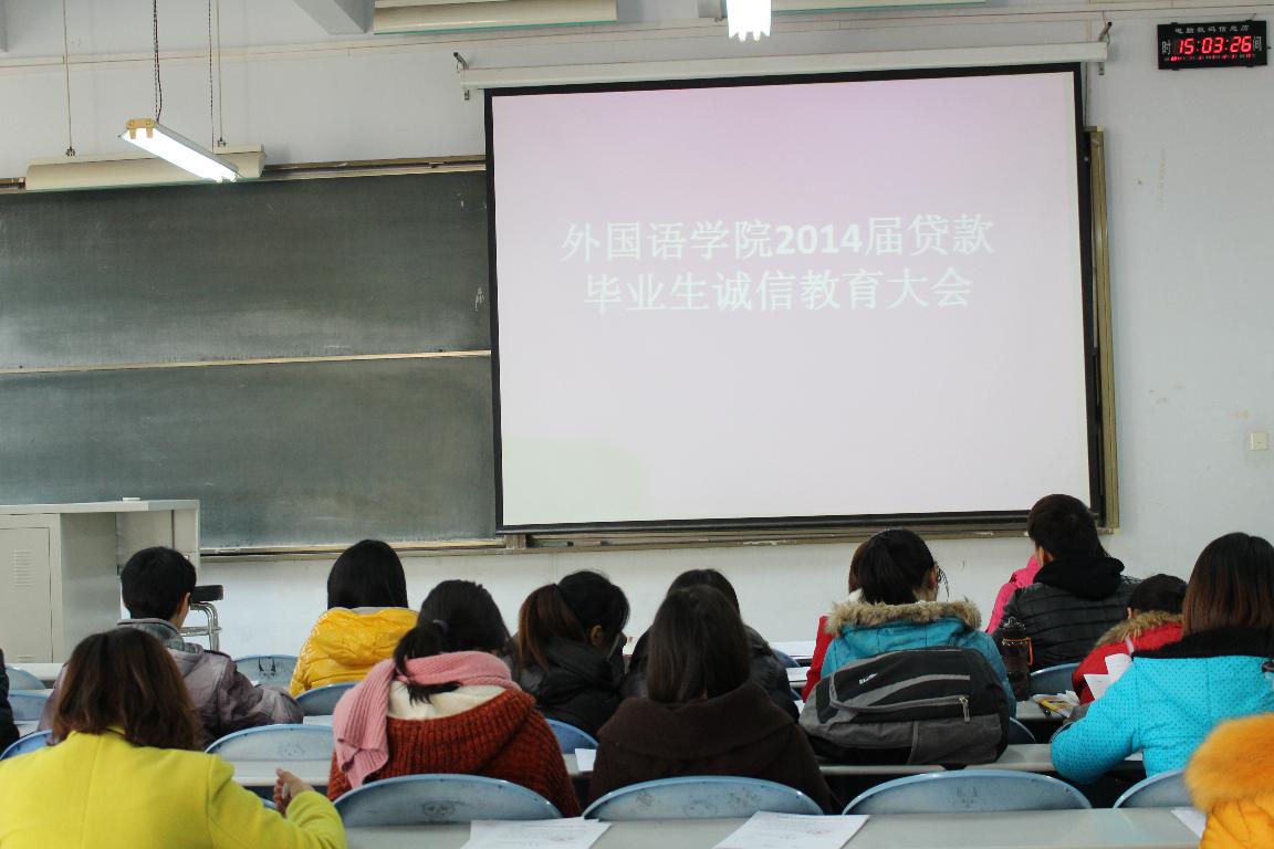 1月3日下午,做爱漫画 在教三楼107教室召开2014届贷款毕业生诚信教育大会,学院党总支副书记孔祥娟、负责贷款老师及2014届全体贷款毕业生参加会议。