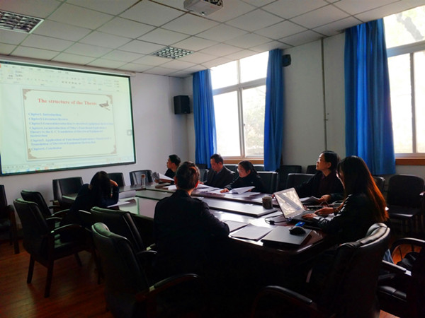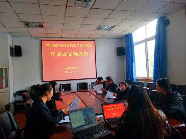 3月28日下午,做爱漫画 2016级国际商务英语硕士研究生在东二楼306进行毕业论文预答辩。预答辩会由边铀铀副院长主持,陈文凯院长担任评审组长,李秋霞、闫朝晖、陈甜、赵祥云等导师担任评审组成员。