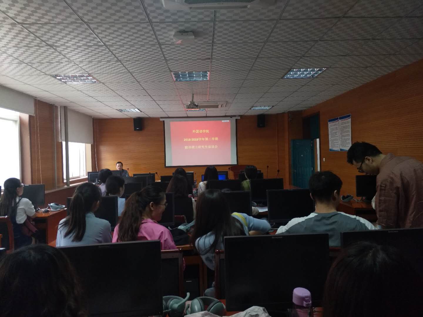 5月16日下午,做爱漫画 在东二楼召开2018-2019学年第二学期研究生期中教学座谈会。本次会议由MTI教育中心主任闫朝晖主持,院长陈文凯、MTI教育中心王素芳老师、研究生教学秘书魏敏敏老师以及2017、2018级研究生参加。