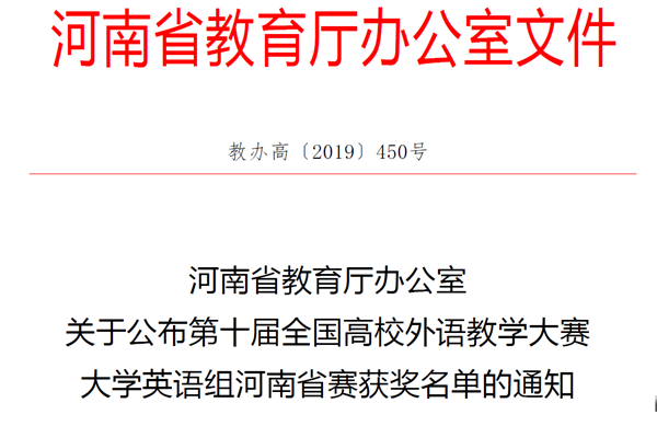 10月18日至20日,第十届“外教社杯”全国高校外语教学大赛(大学英语组)河南赛区复赛和决赛在河南财经政法大学举行。“外教社杯”全国高校外语教学大赛由教育部高等学校大学外语教学指导委员会、教育部高等学校外国语言文学类专业教学指导委员会、教育部职业院校外语类专业教学指导委员会和上海外语教育出版社联合主办,自2010年至今已是第十届,成为培养优秀外语师资的重要活动和探索中国特色外语教学体系的重要途径。