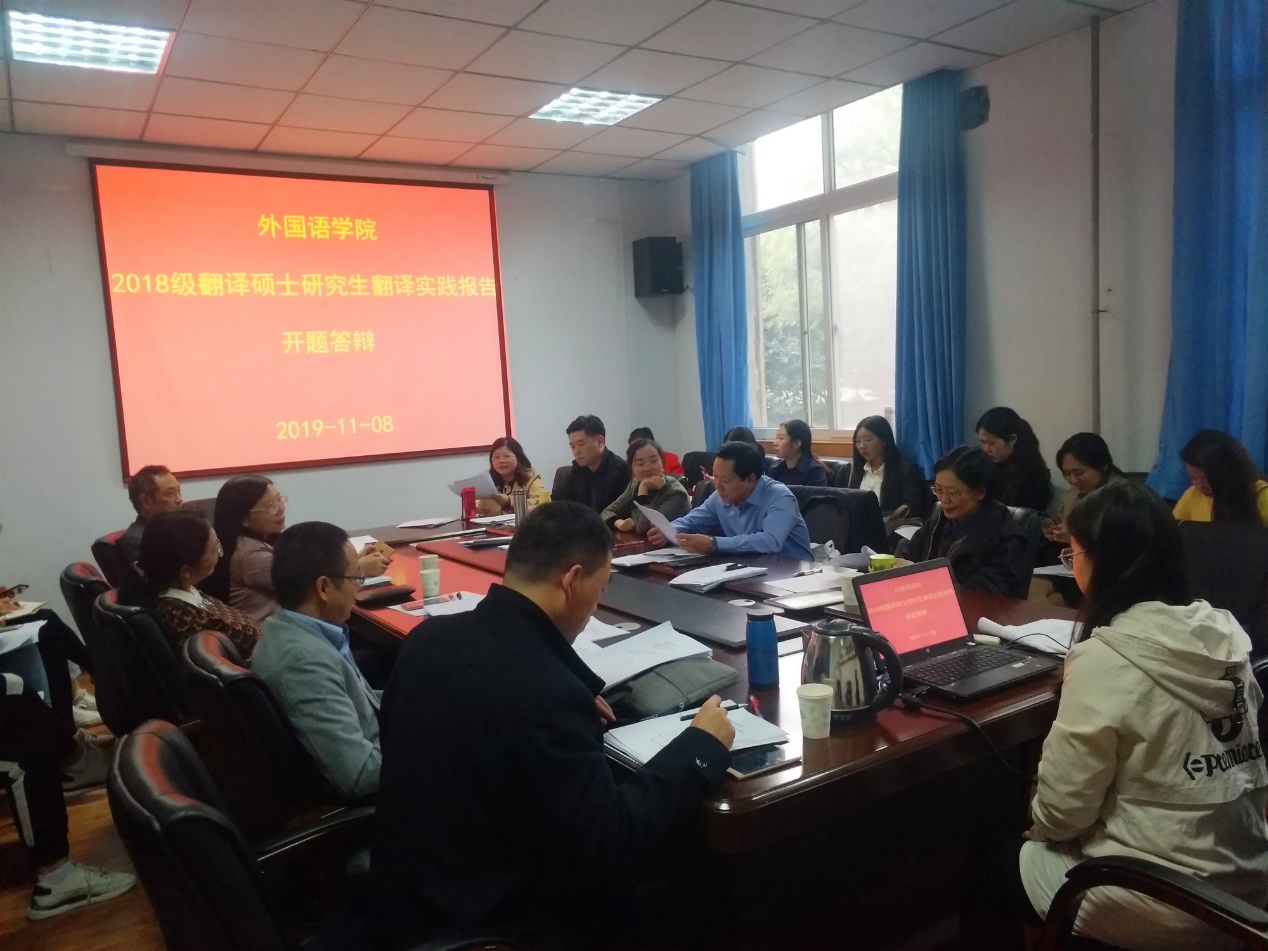 11月8日下午,做爱漫画 在东二楼306举行2018级翻译硕士开题答辩会。答辩会由陈文凯院长主持,河南大学外语学院刘泽权教授应邀参加,2019级翻译硕士研究生旁听。