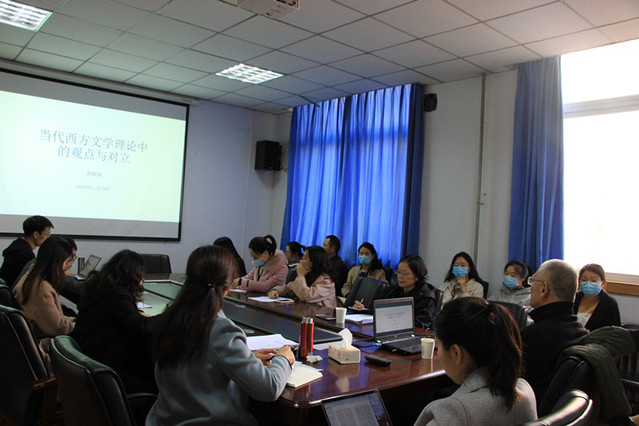 首先,程朝翔教授指出当代西方文学理论的流派和观点极为繁杂,也充满对立。接着,程教授重点阐释了一些重要的观点以及观点之间的对立。例如,身份政治、文明冲突等观点反映了西方的一部分现实,但反过来也可能会加剧冲突;而普适的共同体观点则强调包容、和谐、消除差别,更利于社会的和谐。我们应该警惕西方强调冲突的观点,而借鉴倡导共同体建设的观点,建设和谐社会。最后,程教授提出确定个人兴趣及方向的重要性,并与在座教师关于论文发表、项目申报等进行了交流,强调应扎实学术基础,在专注个人领域的基础上有所拓展,与时俱进。