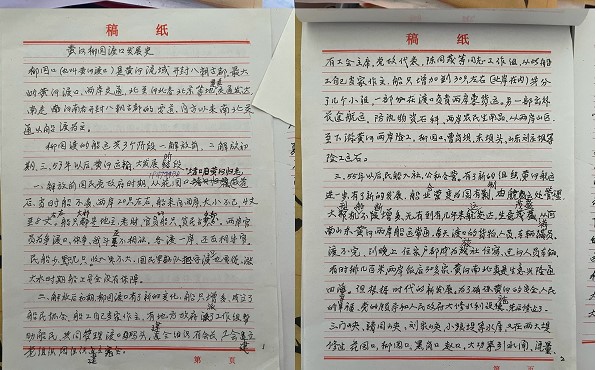 为了更好地深入了解沿黄文化,实践队员来到了附近的和尚庄村,面对面访谈了这里的一位老党员——87岁的焦万岭爷爷。和尚庄村是周边乡村振兴的试点村,村内环境优美,村民们住着国家统一出资重建的楼房,生活惬意,对国家乡村振兴政策赞不绝口。焦爷爷告诉队员们,以前这里流传着许多好听的船工号子,随着时代的变迁都流失了,但他对这些船工号子进行了整理,并谱上了词,现场为同学们展示了一小段。此外,他展示了他多年来写下的关于开封、柳园口乡、和尚庄村的历史和故事,以及自学的书法和工笔画。