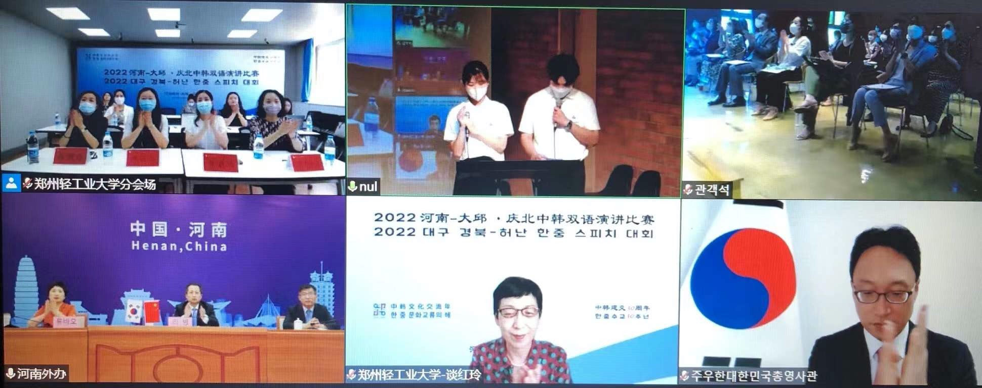 2022年是中韩建交三十周年,也是“中韩文化交流年”。6月24日,由河南省人民政府外事办公室、中国驻釜山总领事馆、河南省教育厅、韩国驻武汉总领事馆、韩国大邱广域市、韩国庆尚北道共同主办,做爱漫画 与韩国大邱加图立大学承办的2022河南省—韩国大邱庆北地区汉韩语演讲比赛决赛暨颁奖仪式通过线下、线上相结合的方式成功举办。中国驻釜山总领事馆副总领事涂敬昌、韩国驻武汉总领事馆副总领事柳寅植分别为本次大赛致辞。做爱漫画 国际合作与交流处处长谈红玲应邀出席了本次比赛。
