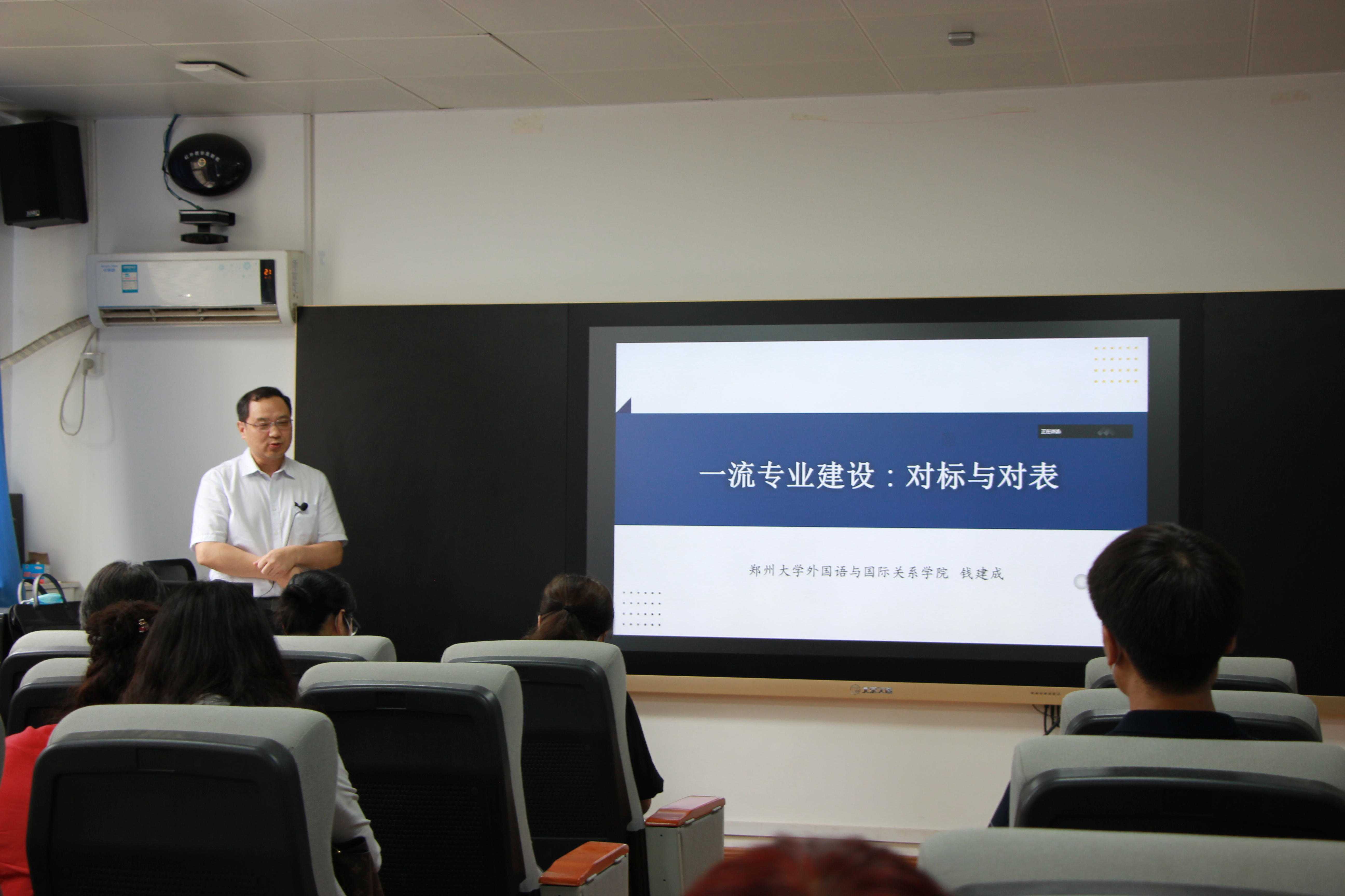 会上,学院特别邀请郑州大学外国语与国际关系学院院长、博士生导师钱建成教授做了题为“一流专业建设:对标与对表”的学术报告。报告主要围绕“对照国标,守正笃实”和“对表一流,创新发展”两个方面展开。钱院长首先对《普通高等学校本科专业类教学质量国家标准》做了深入解读。他介绍了“国标”颁布的背景及其特点,认为“国标”既对专业提出统一要求、保障基本质量,又为专业人才培养特色留有足够拓展空间。他阐释了“国标”对英语专业性质和学科内涵的设定,指出外语类专业是我国高等学校人文与社会科学学科的重要组成部分,外语学科要顺应国家战略,走与国家利益、社会需求相适应的新路径,通过学科交叉和知识融通,形成外语专业人才跨学科知识结构。接着,钱院长详细探讨了一流专业的建设路径。他从明确专业特色定位、制定合理培养方案、打造一流教师队伍、深入推进教学改革、重视培养质量显性指标等五个方面说明了一流专业建设的策略和操作方法。他还特别介绍了郑州大学英语专业围绕“三有”人才构建“家国情怀”“全球视野”“专业本领”课程群、建立“科研档案”大力资助教师科研发展、对标“两性一度”打造金课、结合学校强势学科改革人才培养模式等系列创新举措。