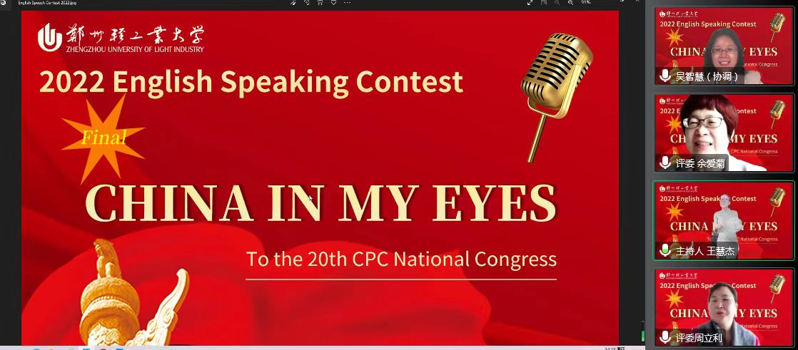 联合组织了2022年全校大学生英语演讲比赛,此次演讲比赛以“喜迎二十大——CHINA IN MY EYES”为主题。