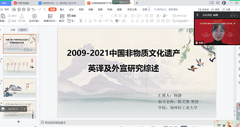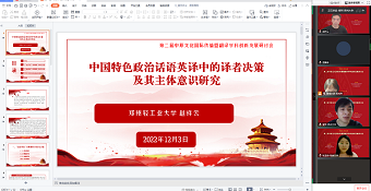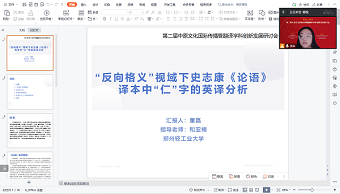 我院4名师生在四个分论坛上分别做了主旨发言。翻译硕士研究生导师赵祥云博士在“中国特色政治话语翻译研究”分论坛做了题为“中国特色政治话语英译中的译者决策及其主体意识研究”的发言,发言基于“政治等效”和“政治特效”原则,探讨了中国特色政治话语翻译中的译者决策。翻译硕士研究生导师赵永刚博士在“黄河文化翻译与传播”分论坛做了题为“黄河话语中的中原城市群国际形象建构研究”的发言,发言从传播主体、传播路径和传播效果三个方面探讨中原文化对外话语创新及中原城市群国际品牌塑造策略。21级研究生杨静在“翻译与对外话语体系建设”分论坛做了题为“2009-2021 中国非物质文化遗产英译及外宣研究综述”的发言,发言分析了这一时期中国非遗英译及外宣研究存在的问题,并提出相关建议和措施。21级研究生董磊在“生态翻译理论与中原文化翻译”分论坛做了题为“‘反向格义’视域下史志康《论语》译本中‘仁’字的英译分析”的发言,发言梳理了史志康《论语》英译本的研究现状,分析了核心术语“仁”字的英译策略。