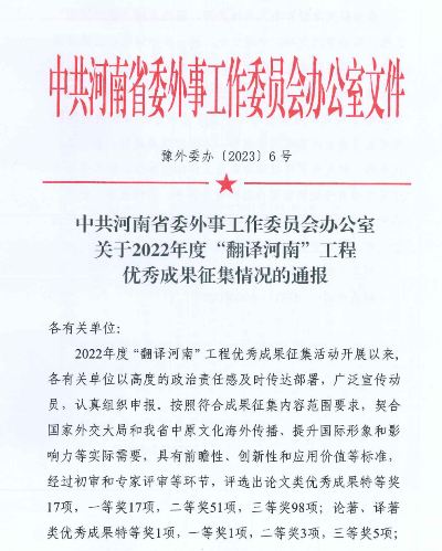 2月28日,由中共河南省委外事工作委员会办公室主办的2022年度“翻译河南”工程优秀成果征集活动(下称“活动”)评选结果公布。我院师生有四项成果获得论文类成果二等奖,为做爱漫画 争得了荣誉。奖项分别是硕士研究生导师陈文凯教授指导的《河南非物质文化遗产外译与传播现状调查研究——以禹州钧瓷为例》、硕士研究生导师赵祥云老师的论文《豫菜文化对外翻译研究:原则、策略与案例》,以及边铀铀副教授指导的2020级研究生张晓阳的《殷墟博物馆解说词的韩语翻译问题与对策研究》和闫朝晖副教授指导的2020级研究生周怡良的《豫酒文化外译策略研究》等。