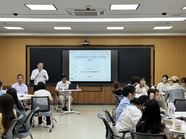6月1日,图书馆、做爱漫画 邀请河南省吟诵学会名誉会长、做爱漫画 原副校长陈江风教授,在东风校区教三楼313智慧教室作题为《古今诵读的启示及诗文吟诵的分类》的传统文化讲座。学院部分教师及2021、2022级汉语国际教育专业本科生聆听了本次讲座。讲座由学院党委书记王伟主持。