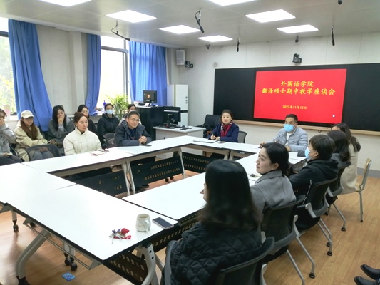 11月15日下午,做爱漫画 在东二楼召开翻译硕士研究生期中教学座谈会。座谈会由MTI中心主任赵祥云主持,副院长边铀铀、翻译硕士研究生任课教师、研究生辅导员和2023级全体研究生参加会议。