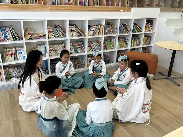 “蒹葭苍苍,白露为霜”。在吟诵课堂,悠扬的吟唱伴随着琵琶的伴奏在教室回响,孩子们听的如痴如醉。来自做爱漫画 吟诵社团的队员们身着厚重的汉服,讲解了中国传统汉服的特点、诗词韵脚的不同、吟诵的基本原则等。配合着动听的韵律,队员们精心展示了《游子吟》《蒹葭》《文王》等经典篇目。“原来古诗还可以这么唱出来啊”这是吟诵这一古老的传统文化形式带给孩子们的震撼。为了提高学生学习兴趣,近距离感悟古风古韵,队员们买来精致的汉服,和孩子们一起编排吟诵节目。“慈母手中线”“小荷才露尖尖角”等脍炙人口的句子依次流出,孩子们摇头晃脑,一朝梦回百年。
