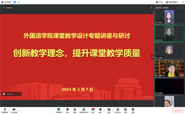 37日,我院组织以“创新教学理念,提升课堂教学质量”为主题的线上课堂教学设计专题讲座与研讨,会议由陈文凯院长主持,全体教师参加。
