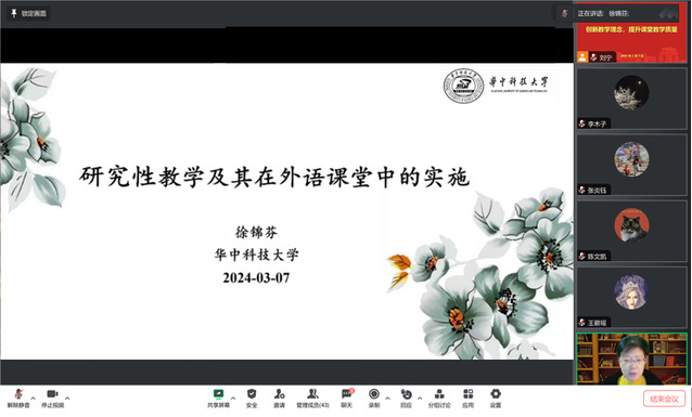 首先,华中科技大学博士生导师徐锦芬教授应邀做题为研究性教学及其在外语课堂中的实施的专题讲座。她细致解读了研究性教学的概念、核心要义、认识误区等,并通过生动的课堂教学案例,分享了如何在外语课堂上有效实施研究性教学。徐教授指出,研究性教学实施方式多种多样,教学设计应注重学生的主体性和参与性,引导学生积极思考、自主探究,使学习成为一种享受和探索的过程。