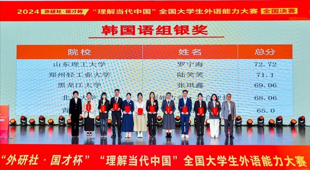近日,我院朝鲜语专业2021级陆笑笑在2024“外研社·国才杯”“理解当代中国”全国大学生外语能力大赛全国决赛韩国语组中荣获银奖。我院教师夏月亮、刘春平、李木子全程参与指导。