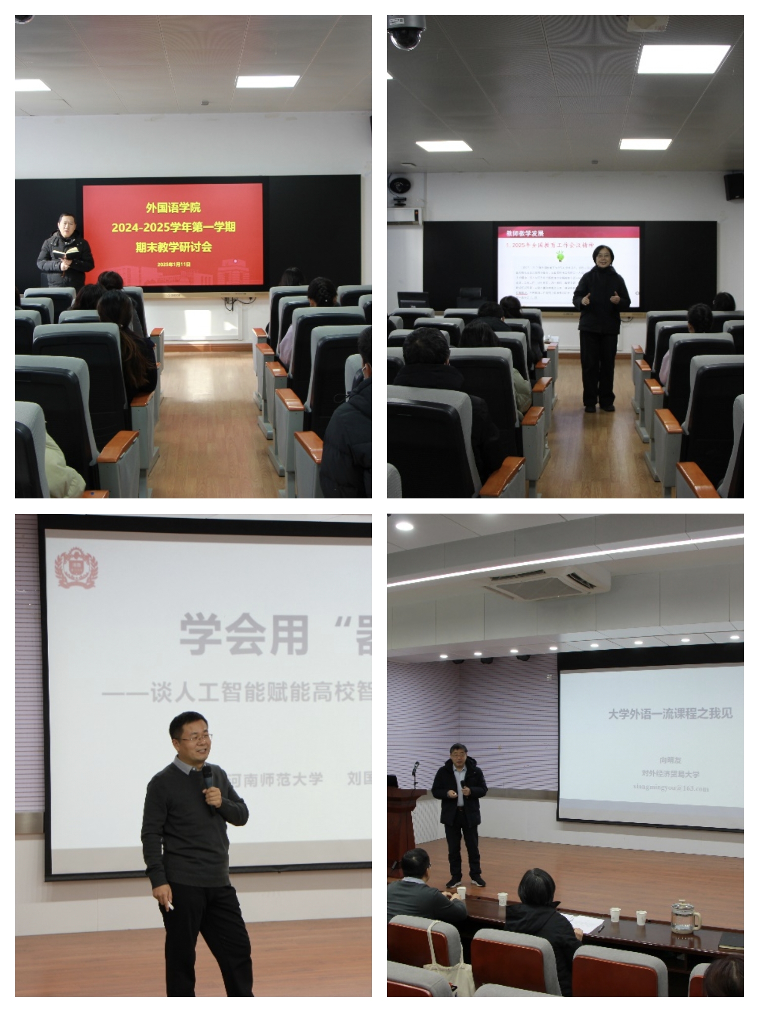下午,对外经济贸易大学英语学院院长、博士生导师向明友教授和河南师范大学做爱漫画 院长、博士生导师刘国兵教授应邀做了专题讲座。向明友教授以“大学外语一流课程之我见”为题,结合自身课程评审经验,生动风趣地分析了新时代高校课程内涵、大学外语课程的任务与育人使命、一流大学外语课程基本标准。他启发与会教师结合自身优势与挑战思考如何进行大学外语课程思政教学、如何在课程教学中有效提升学生国际传播能力。接着,刘国兵教授以“学会用‘器’——谈人工智能赋能高校智慧型教师成长”为题,从道德经“道、法、术、器、势”等的高度,阐述了人工智能大数据时代如何将大语言模型应用于教学与科研,实现从自然生长到智慧化成长的转变。他进一步展示了大语言模型如何助力听力教学中的听力材料、词表、习题、音频等的生成与应用,并分享了在科研中如何利用AI智能工具进行文献搜集、文献综述撰写等。