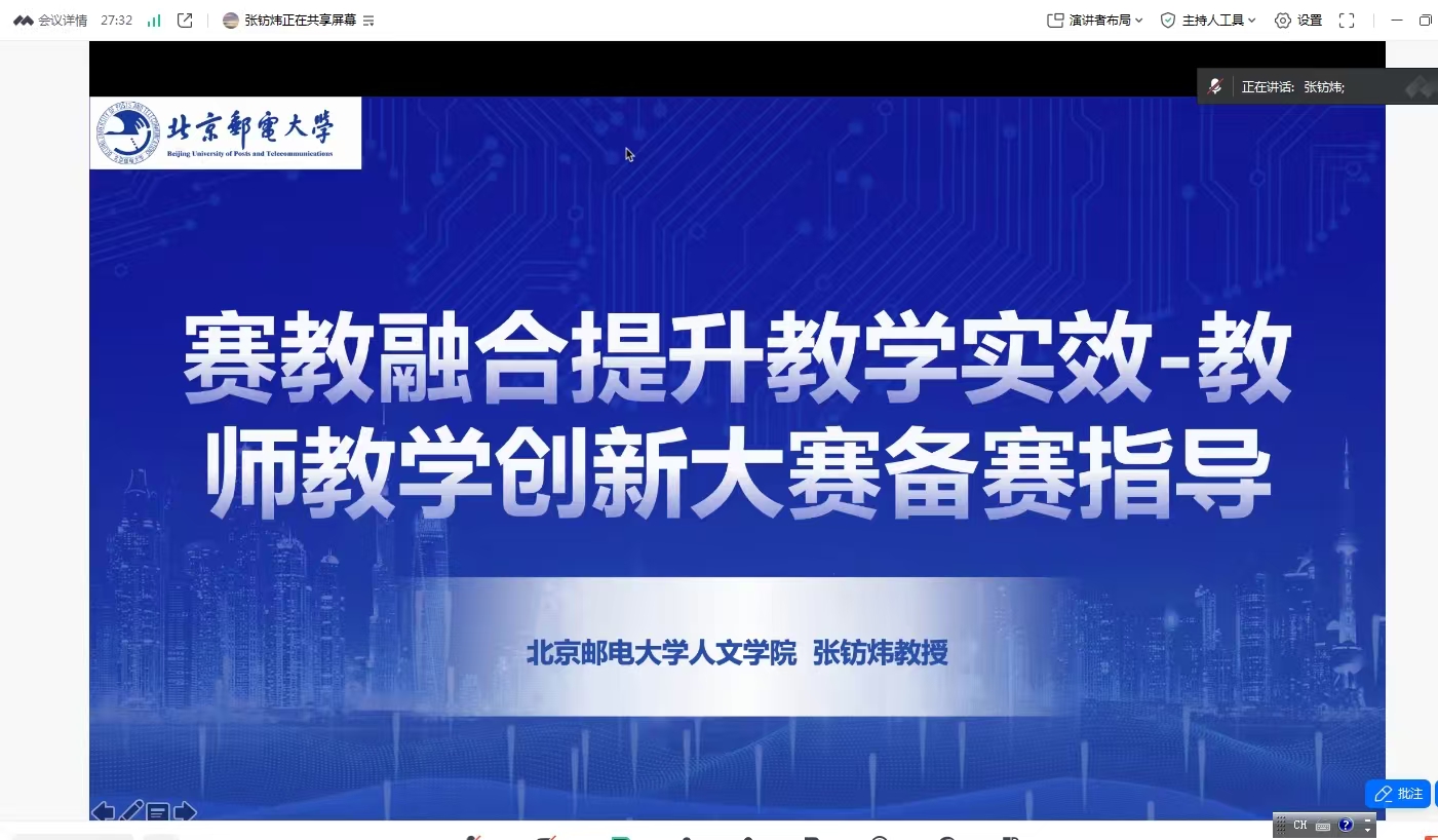 邀请北京邮电大学张钫炜教授作线上讲座,分享其全国高校教师教学创新大赛经验。张炎钰副院长主持此次讲座。