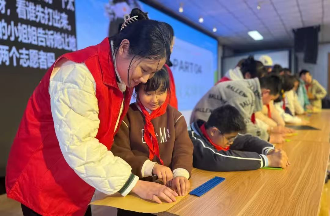 接下来的“盲文初体验”,让志愿者们走进了视障学生们的世界。同学们握住志愿者的手,引导他们使用盲文板和盲文笔刻下名字的首字母。志愿者们闭上双眼,用指尖触摸着凹凸的盲文符号,感受着用点阵拼出的世界。