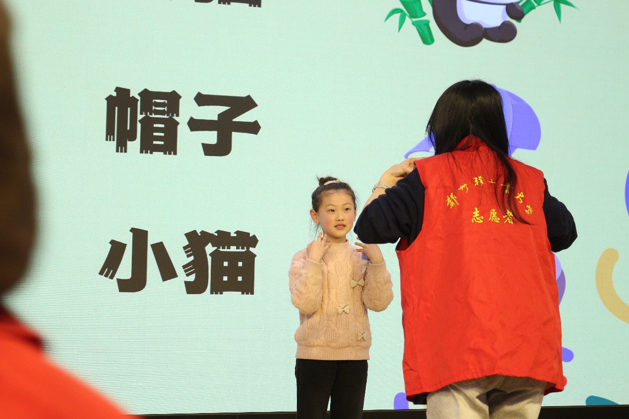 紧接着,在“手语传递温暖”环节中,志愿者们化身为手语学徒和聋哑学生两两组队,在这些小老师的耐心指导下学习基础手语对话。“你好”“谢谢”“朋友”“爱你”这些简单的词汇在指尖流淌,无声的交流中激荡出温暖的共鸣。随后的“你比我猜”游戏中,同学们情绪高涨,积极参与其中,在赢得游戏获得奖品后,和同组的志愿者默契击掌分享喜悦。