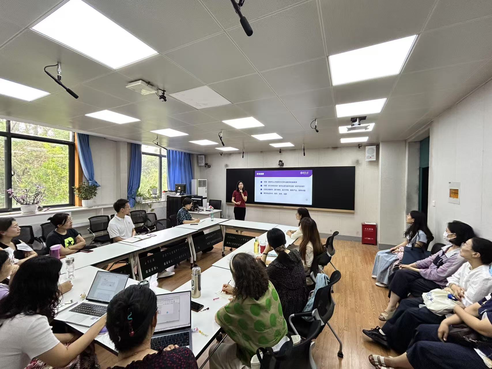赵燚博士首先做了题为“以‘赛’促‘教’的教学思考”的专题讲座。她结合清华大学语言中心公共外语新课程体系,阐述了赛教融合的逻辑与实践,并以全球胜任力六大素养为框架,论证了外语教学中跨文化能力培养与课程思政的融合路径。她强调教学比赛设计也要以解决学情为抓手,同时在设计中体现“教材-教师-学生- AI”四要素的有机结合,实现比赛对日常教学的反哺。