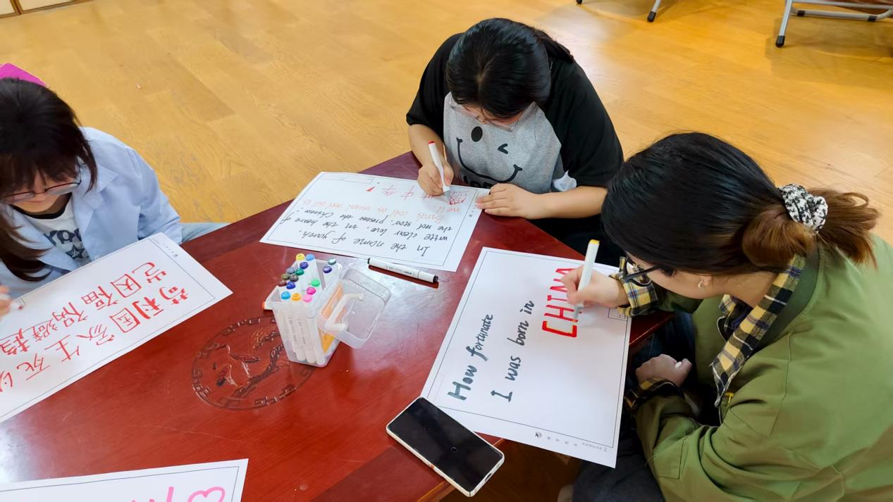接着,同学们开展“和平之声”多语种书法撰写活动,利用专业语言书写爱国情,一笔一划间,不同语言的文字在纸上流淌,既有“苟利国家生死以,岂因祸福避趋之”的铿锵誓言,也有“何其有幸,生于华夏(英语)”的深深自豪,更有“我爱你中国(朝鲜语)”的真挚热爱。这些书法作品承载着青年心声,不仅展现了同学们扎实的语言功底,更传递出新时代青年对和平的深切呼唤与对祖国的赤忱热爱。活动结束后,同学们纷纷表示,作为新时代青年要珍惜和平的来之不易,也要继承先烈遗志,把爱国之情转化为报国之行!