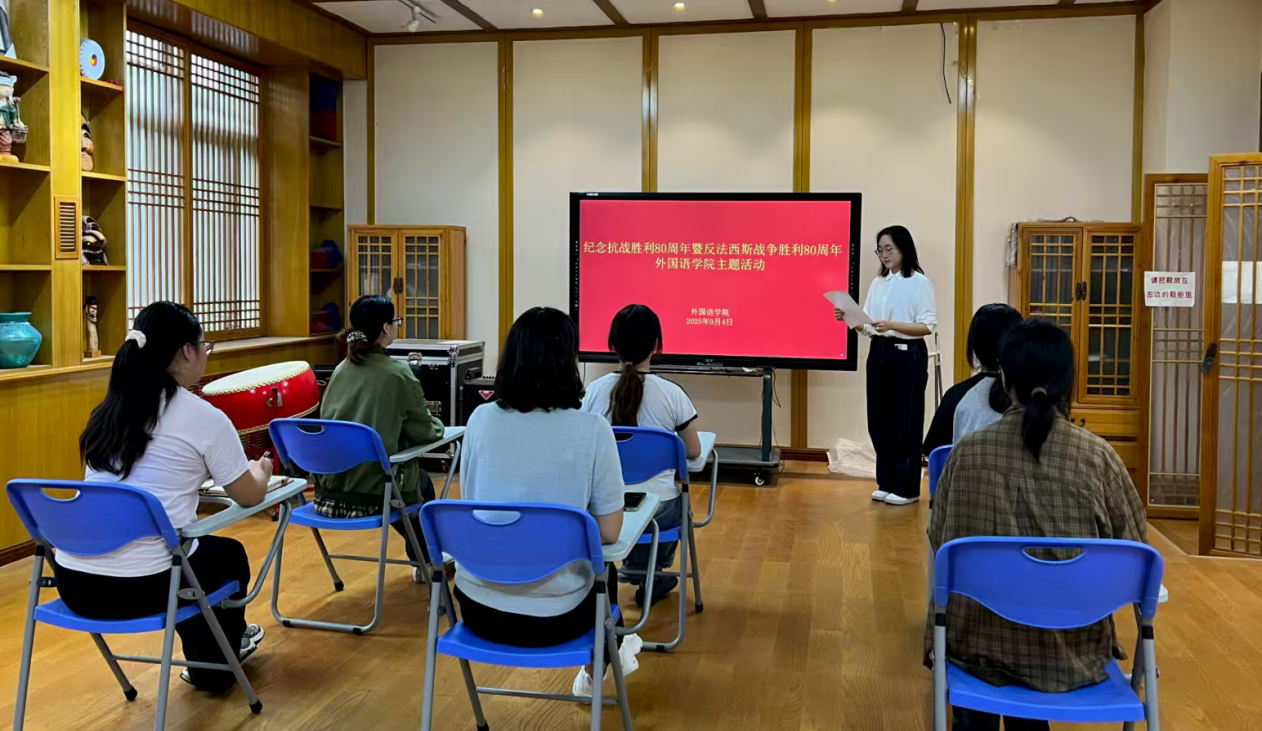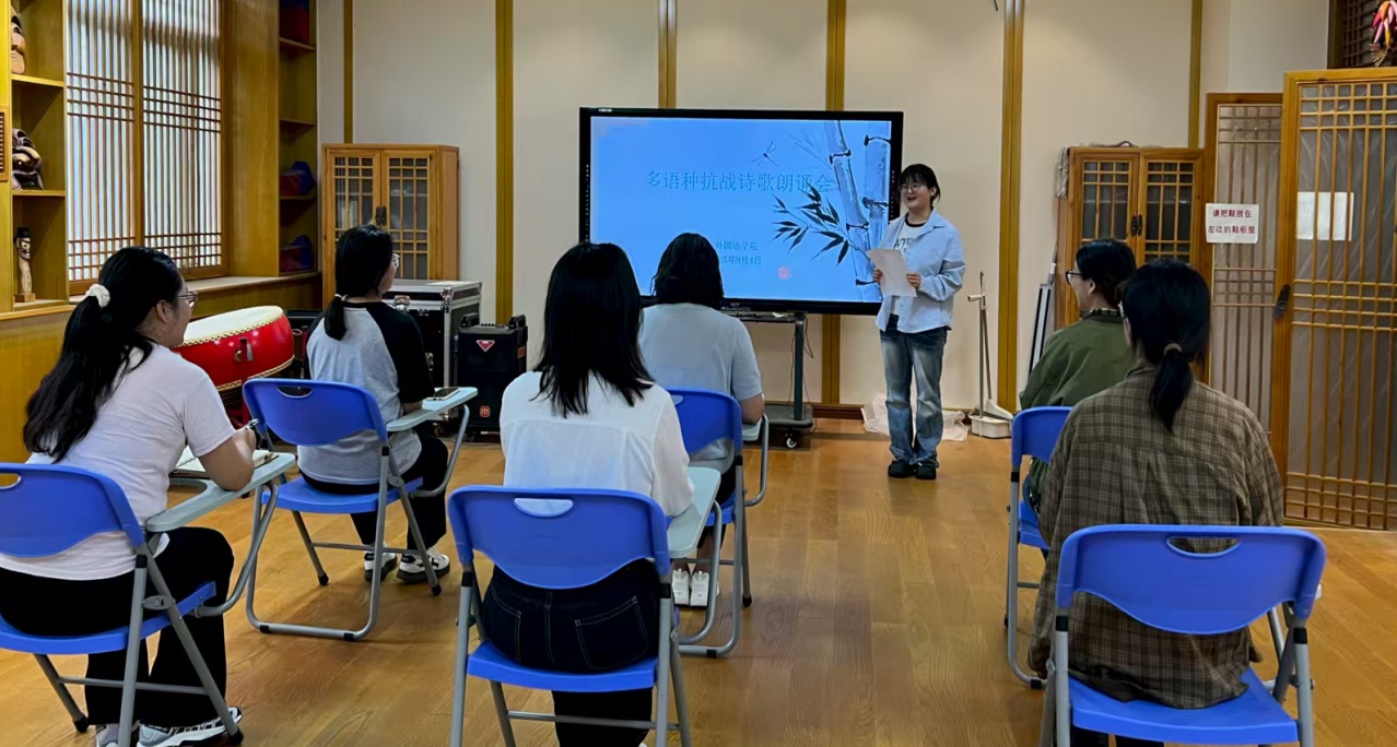 活动伊始,同学们积极交流分享了观看九三阅兵的心得体会,随后结合自身所学语种,用英语、朝鲜语、汉语朗诵了抗战时期经典诗篇与文献节选,《致逝者》(英语)、《我爱这土地》等,抑扬顿挫的语调中饱含着对先烈的缅怀与对和平的珍视。