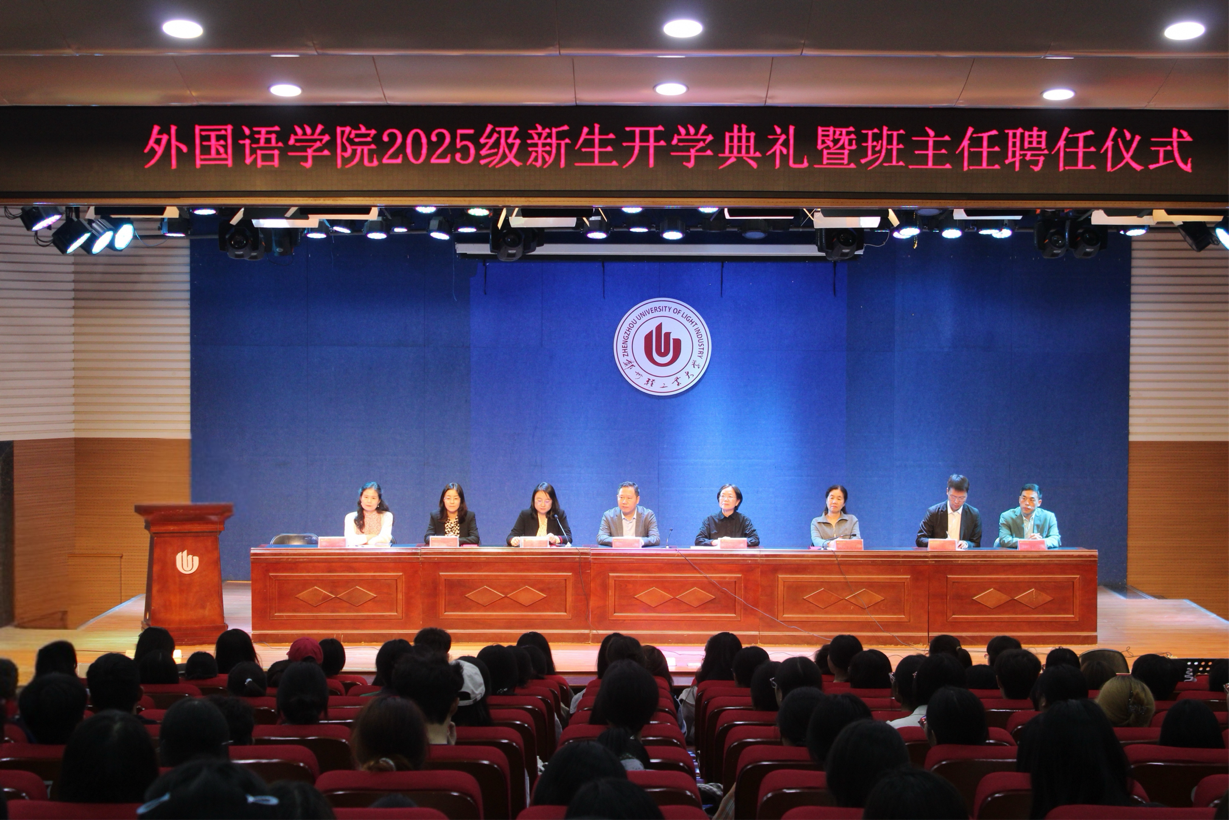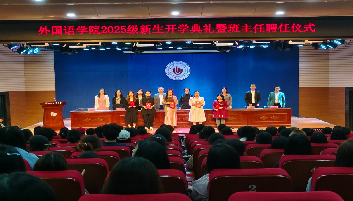 随后,我院进行2025级新生班主任聘任仪式。教师代表英语系黄梦迪老师上台发言,她号召同学们要提升思辨能力、拓展国际视野;夯实基本功、增长才干;以时间为友、在语言学习的路上能够寻找乐趣、克服困难、不断进步!