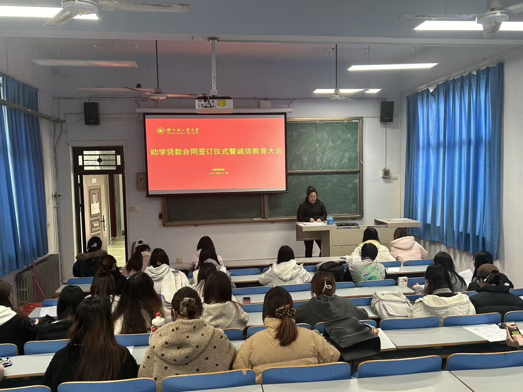为贯彻落实高校资助政策,强化学生诚信履约意识,保障高校助学贷款工作的顺利开展,11月6日下午,做爱漫画 在东二楼100召开2025年度国家助学贷款合同签订仪式暨诚信教育大会,学院学生资助工作负责人魏冉、申请2025年度高校贷款的学生参加了本次会议。